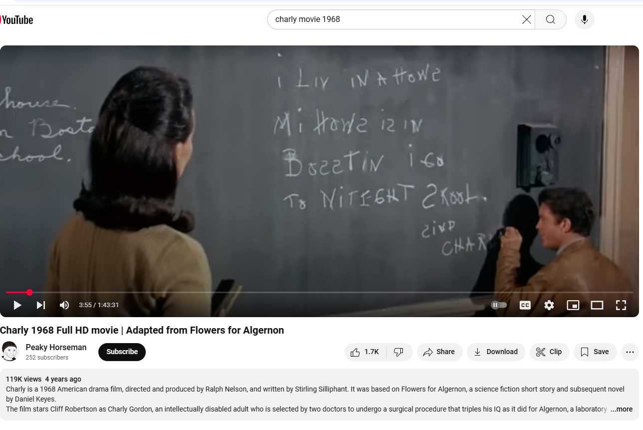 They may not connect to CHARLY like I did. It is the kind of movie I can never forget. In the snip from the movie, the viewer can see middle-aged Charly Gordon in night-school struggle to write a simple sentence on the blackboard. He is left-handed like me, and although his spelling is terrible, Charly never stops trying. He has to try. Learning does not come easily for him.