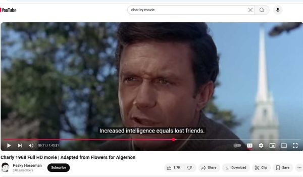 The movie CHARLY came out in 1968, starring Cliff Robertson and Claire Bloom. Ravi Shankar, the Indian sitar-player, provided the soundtrack. It had a high-end, 1960s orientation that allowed it only a short run in theaters, then it disappeared from view. I did not actually see it until the late '70s when the public library in my hometown showed CHARLY during a weekly film program that it hosted. My readers can watch it for free, now, on YouTube.