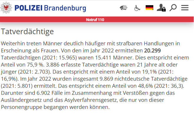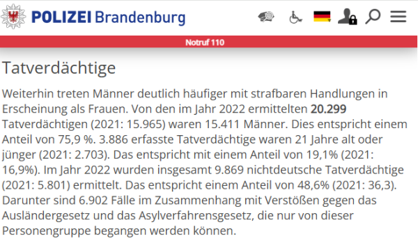 The article also does not mention that fundamental support for the AfD comes from average citizens who have experienced more crime from the immigrants and want greater reforms to Germany's immigration policy. The above-image shows the yearly crime-report from 2022 in the police registry of the province of Brandenburg. The total number of "Tatverdächtige" (criminal suspects) comes to 20,300. Of that total, the immigrants (or "Nichtdeutsche") account for 9,869, or 48% of the total. In some cities, residents avoiding walking in the street alone at night. Again, the "Jede Parole hat eine Folge" article does not mention any of this.