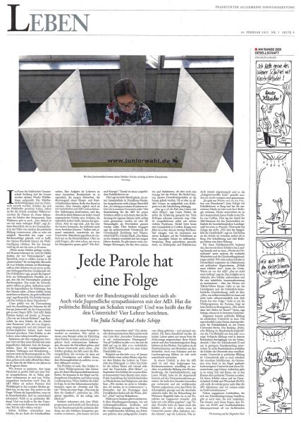The article "Jede Parole hat eine Folge" (Any political slogan can gain a following.) appeared in the Sunday edition of the Frankfurter Allgemeine newspaper on February 16th of this year, written by a pair of staff writers, Julia Schaaf and Anke Schipp. The authors report that high-school teachers in the former East Germany have concluded that, in political matters, their students simply parrot the opinions of their poorly-informed parents and their prejudiced media sources.