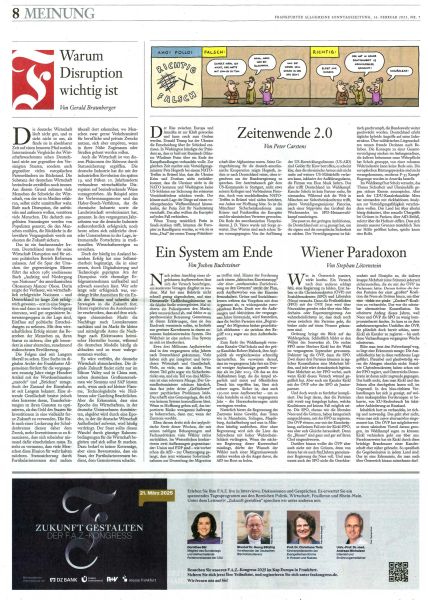 I decided to concentrate on only the "Disruption" article as the most topical, since it follows the decision of President Trump to overhaul, streamline, or eliminate entire departments of the Federal Government. The Frankfurter Allgemeine article follows an article in the German newspaper Die Welt, from 2023—before the Trump victory—which also uses the word "Disruption".