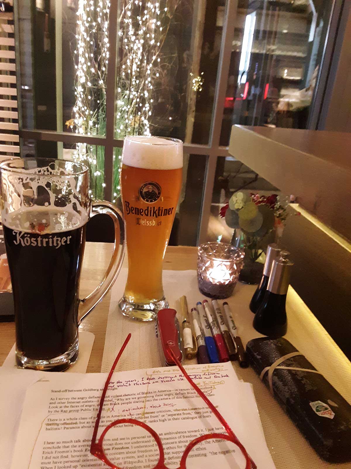 I ran into a problem yesterday when I returned to Germany. On my first evening, I wanted to slake my thirst for German beer, big-time! So I ordered two servings right off the bat. I could sit there, relish the sight of all that beer on my table, and get to drink it, too; but I knew I also wanted some wine and ordered a carafe of it, as well. Shamefully, I have to admit to not finishing either. I slaked my thirst, but had to leave some of it undrunk. I hate wasting anything, but I had work to do and wanted to operate on all my cylinders.