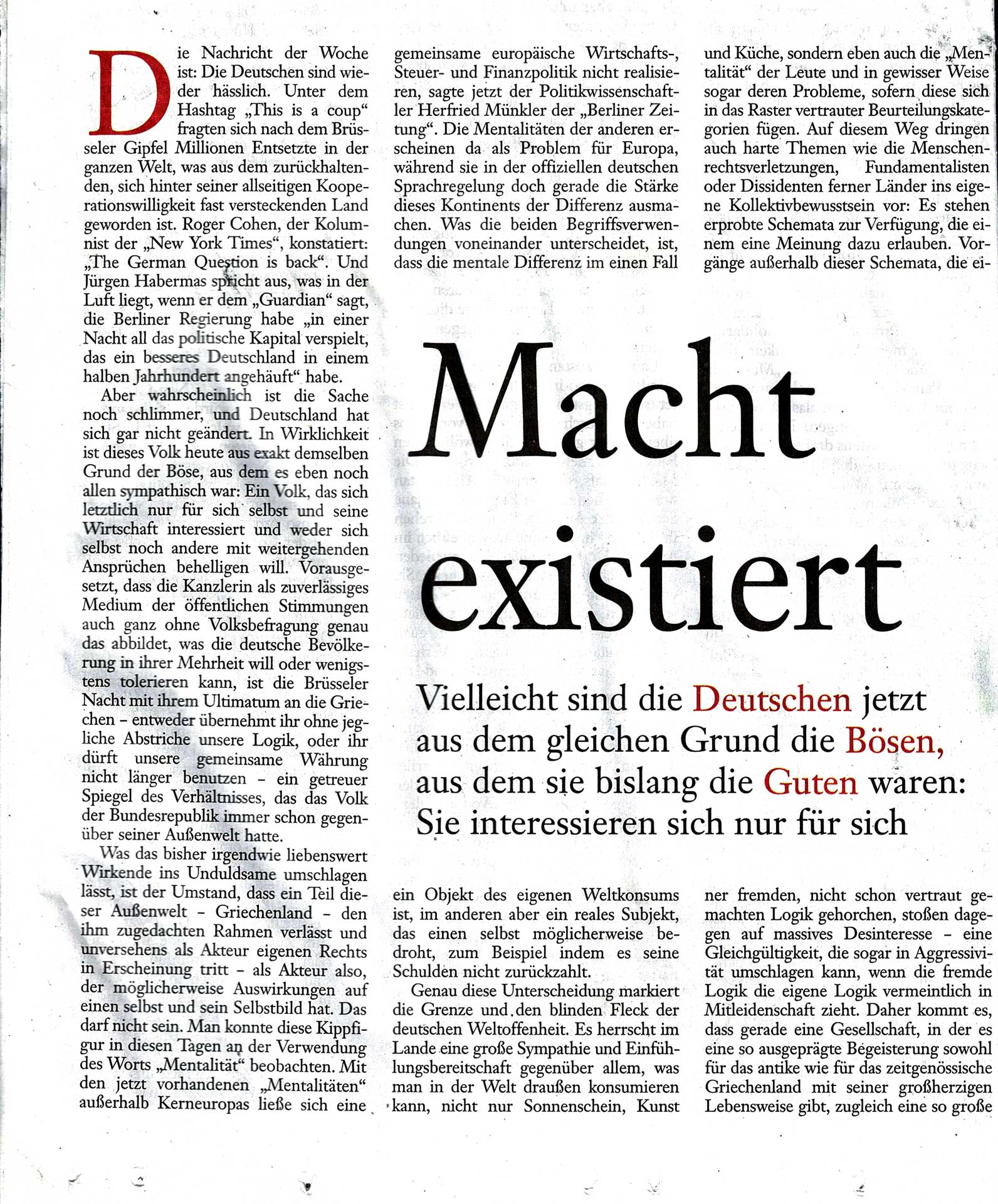 The "Macht Existiert!" article appeared on July 19, 2015 in the Sunday edition of the Frankfurter Allgemeine newspaper, when the German government had to decide whether to bail out the deeply-indebted Greek and Spanish governments, in order to let them remain in the "Euro-zone", Europe's currency district. Europeans shuddered over how powerful Germany had become in relation to the other nations of Europe, since the end of the War.