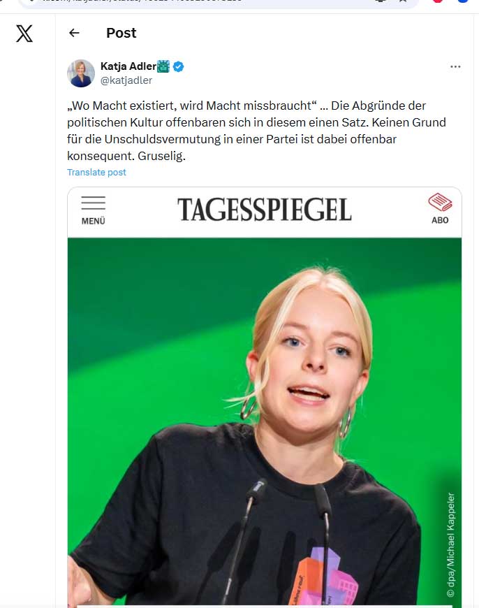 A more recent example of ambivalence is the situation of Jette Nietzard of Germany's Green Party, "die Grüne", the political party most associated with Feminism. Until the end of 2025, Nietzard served as director of the Green Party's youth movement, "die Grüne Jugend". Despite her willowy youthfulness, Nietzard spoke boldly and provocatively in left-wing, feminist terms.