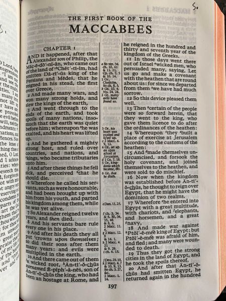At sundown on December 14th, the Jewish holiday Hanukkah will begin and last for eight nights. For all its festiveness, it is a solemn holiday in Judaism that celebrates the Maccabean Revolt, and the reconsecration of the Temple at Jerusalem. Orthodox and Catholic Bibles recount the Revolt in the Book of Maccabees.