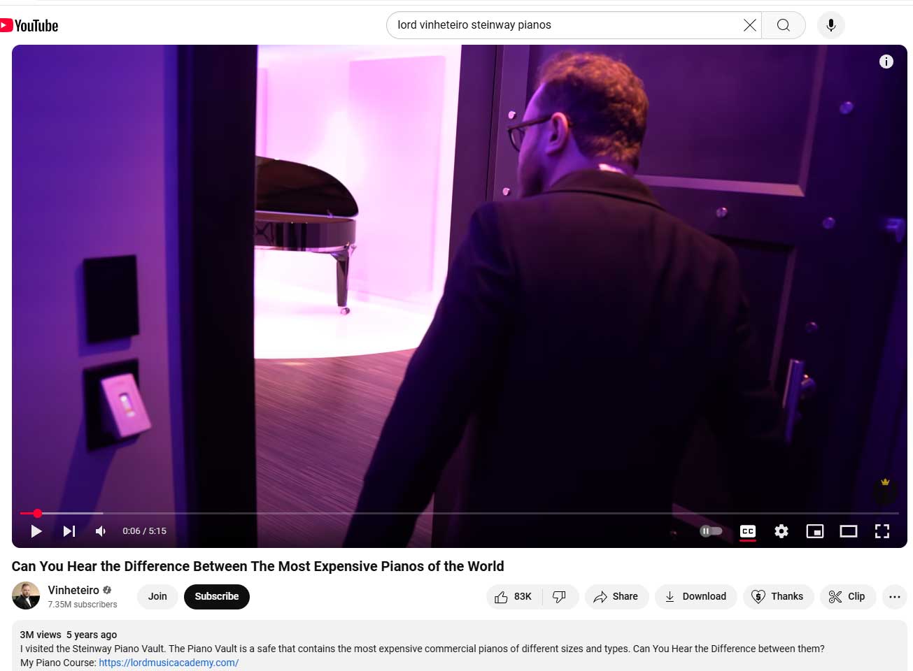 He can play most any instrument, so he doesn't just do Chopin, he also does the melody for Michael Jackson's "Billie Jean", the theme song for "Ghostbusters", and many other popular songs. YouTube shows on each video the number of hits it receives. Not too surprisingly, Lord Vinheteiro's videos get lots of views. His profits from YouTube allowed him to buy a $53,000 piano. He videoed its delivery and reassembly at his studio and posted it to YouTube, as well.