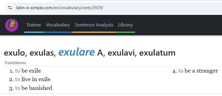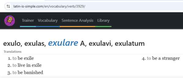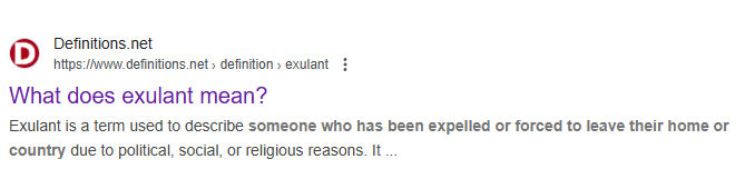 The origin of words interests me, so I looked up "Exulanten" on-line and ran into problems. Google kept trying to direct me to "Exultant". So I went back to the article to check the spelling. No question, they are different words with completely different meanings but some suggestive similarities. Exulant derives from the Latin Exulares, to exile or banish someone. I checked several on-line sources to be sure. "Exultant" also derives from Latin, meaning to express great joy.