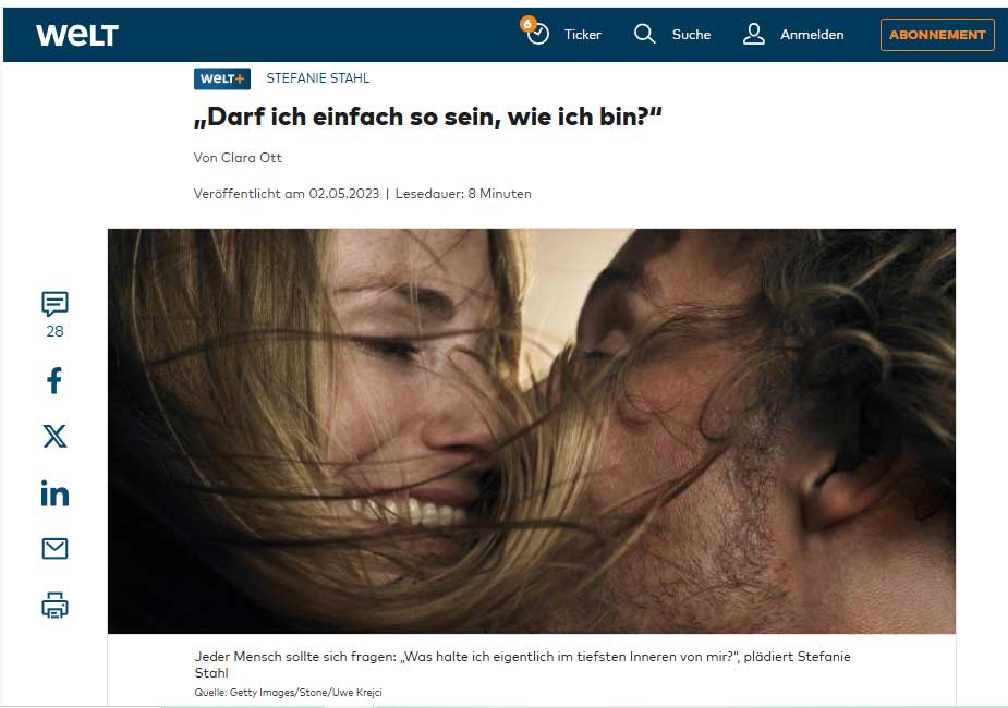 An emphasis in Stahl's work derives from her belief that her clients need to nourish their "inner-child". The American psychiatrist Hugh Missildine coined this term in his book from 1963, titled Your Inner-child of the Past. Ironically, Stahl admits quite early in the article that she wants no children of her own. She has chosen to remain "bewusst kinderfrei", which means that she has consciously chosen to live her life free from children. I have heard other people make similar declarations, like an official notification of intent, so to speak, like filing a lawsuit or subdividing property.
