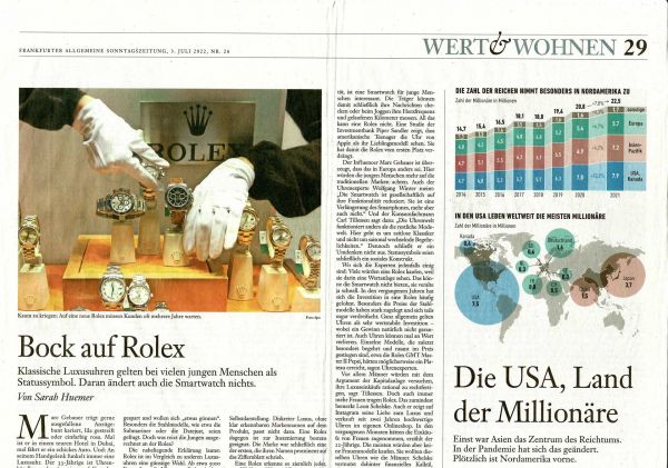 The article "Bock auf Rolex" appeared last July in the Sunday edition of the Frankfurter Allgemeine newspaper. The title translates to "I am horny (like a goat) for a Rolex." The article states that Rolex inscribed its logo on the watch-face long before anyone else did, and set itself the goal of producing the most reliable and most accurate wrist-watch on the market. Of course, with a starting price of $5,000, it should be the most accurate. Since it started business, Rolex has become a "name" brand, with high recognition-value across the globe. It even has an advantage over other international brands, because it offers a "discreet luxury".
